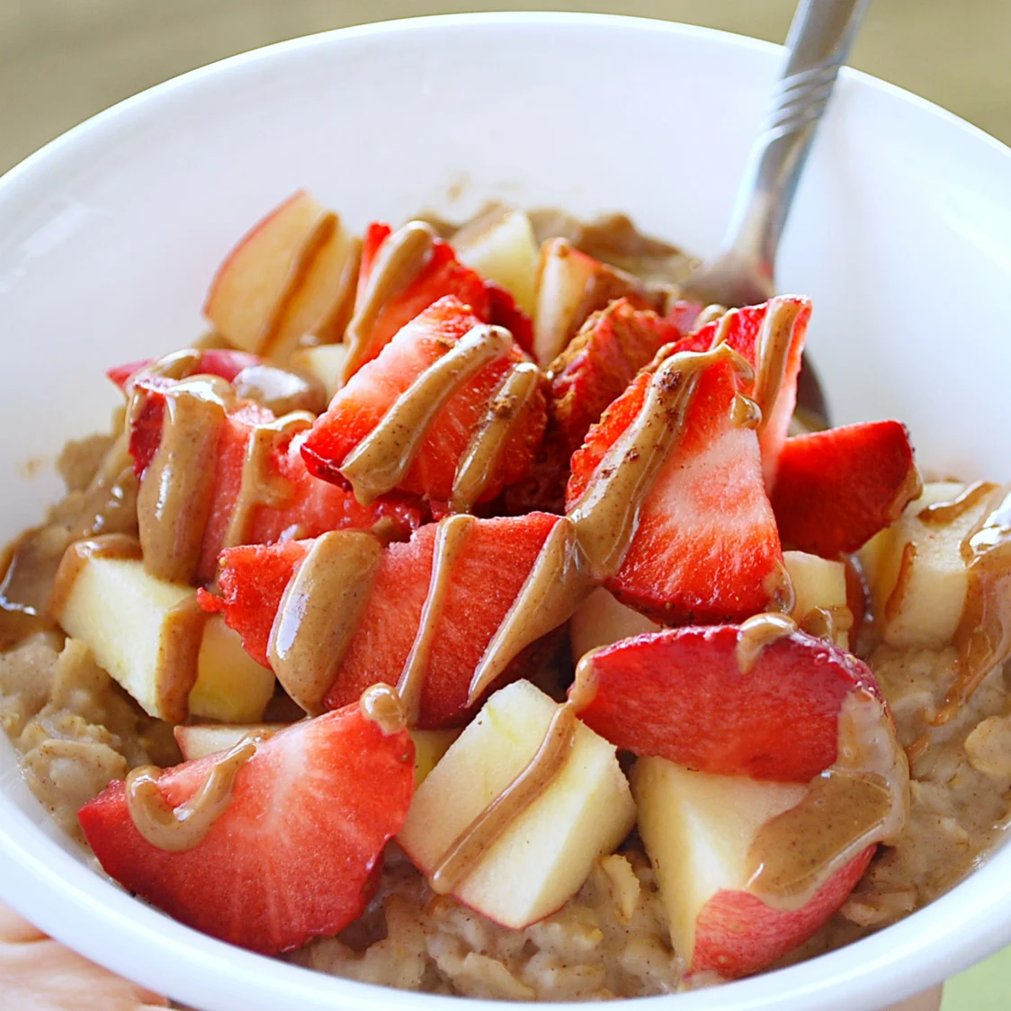 5. Sirve la avena en un plato hondo, agrega la fruta y rocía el resto de la mantequilla de almendra.